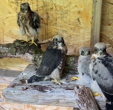 We blind feed the young so that they never associate people with food. As they become ready to fly, they have acres of perfect merlin type habitat on the property to learn and test their hunting skills with continued blind support for those days when wild food eludes them.